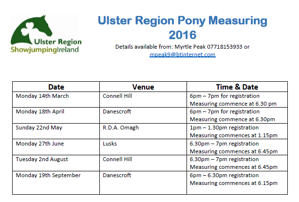 PLEASE VERIFY VENUE, DATE AND TIME 24 HOURS PRIOR TO ATTENDING MEASURING AS THIS DATA CAN BE SUBJECT TO CHANGE. PLEASE NOTE THAT ALL FIRST TIME MEASURING MAY BE CARRIED OUT AT VENUES IN ANY REGION AND ARE NO LONGER RESTRICTED AS PREVIOUSLY , TO THE REGION IN WHICH THE OWNER WAS DOMICILED All ponies 8 and over must have 2 consecutive measurements at an SJI measuring Centre. Measurements are valid only for the calendar year in which they take place PLEASE NOTE J.M.B. MEASURING IDENTIFICATION DOCUMENTS ONLY CANNOT BE ACCEPTED AT S.J.I. MEASURINGS - FULLY RECOGNISED E.U. PASSPORT IS REQUIRED